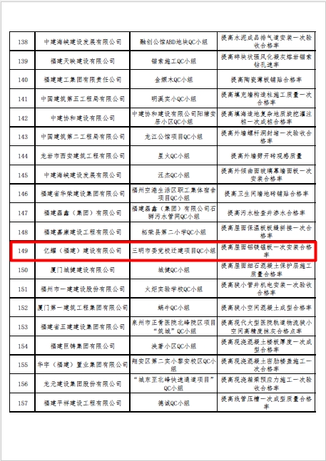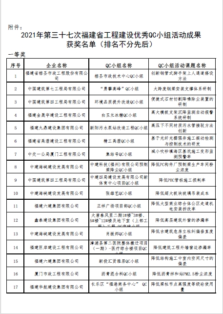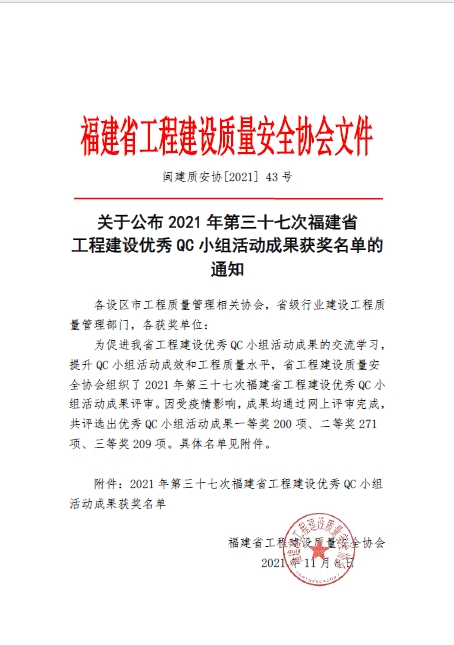 近日,福建省工程建设质量安全协会下发《关于公布2021年第三十七次福建省工程建设优秀QC小组活动成果获奖名单的通知》(闽建质安协[2021] 43号),我司三明市委党校迁建项目QC小组的《提高屋面铝镁锰板一次安装合格率》QC小组活动成果荣获一等级。