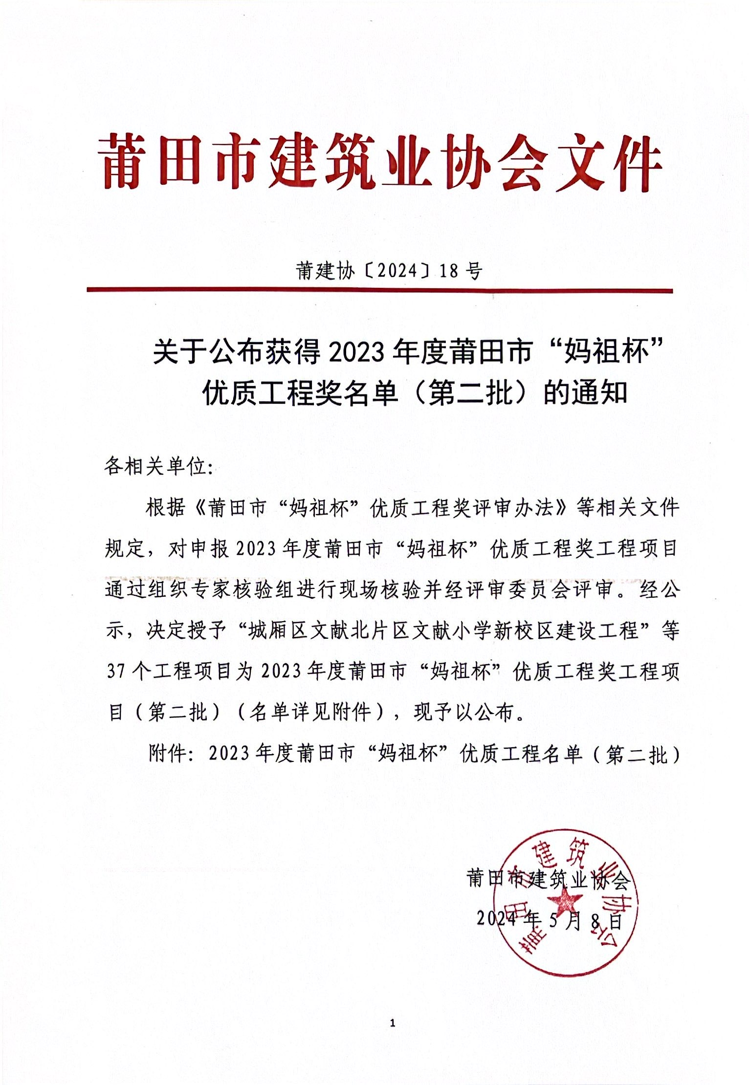 恭贺亿耀建设承建的“荔城区玉湖新城埭里片区改造安置房建设项目C区(EPC)”获得2023年度莆田市“妈祖杯” 优质工程奖